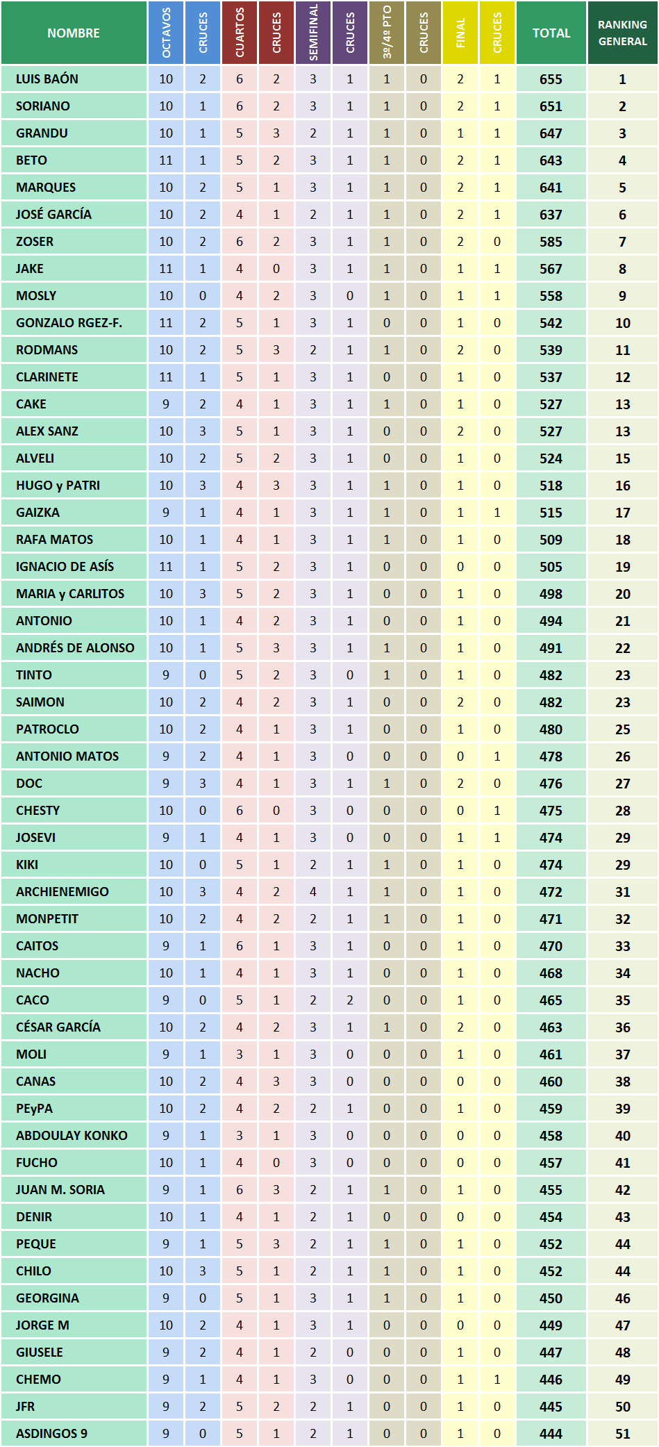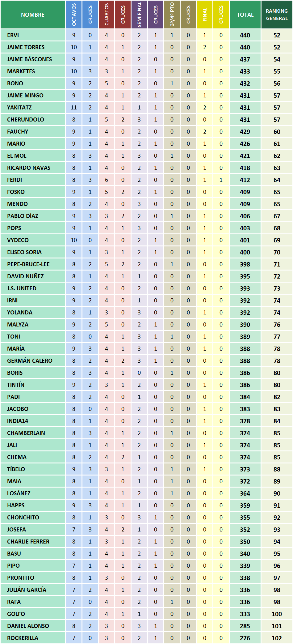Aquí podeis ver, en el orden de la Clasificación General, los equipos que habeis acertado en cada fase y los cruces que habeis clavado. Ya sabeis que solo en los cruces que habeis clavado optareis a sumar quiniela y resultado.